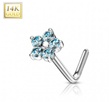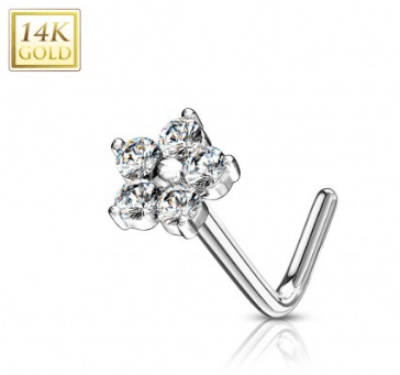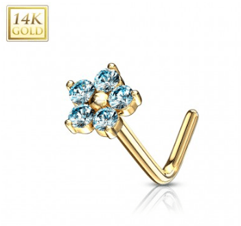Deze prachtige neusstud met kristallen bloem is gemaakt van 14 Karaats Goud. Ideaal als je kiest voor gemakkelijk verwisselen en draagcomfort. Aan het einde van de pin zit een gebogen staafje (L-vorm), zodat je piercing perfect op zijn plek blijft zitten.