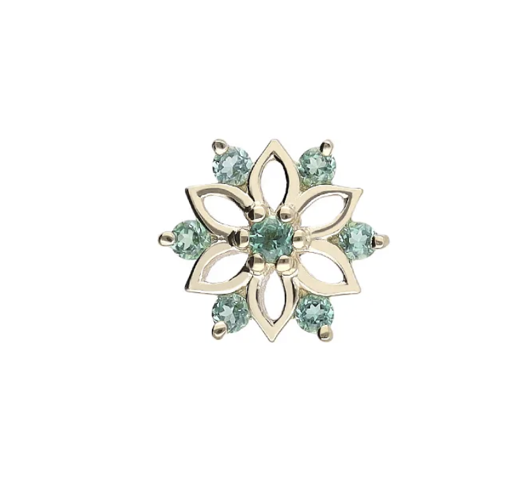 De Kelli London Blue Topaz straalt eigentijdse elegantie uit met zijn diepe, vloeiende oceaankleur. Deze luxueuze pushpin van 14-karaats geelgoud is bedoeld om te dragen in threadless piercingstaafjes met 1mm of 1.2mm dikte, voor optimale veiligheid en gebruiksgemak. De opvallende blauwe topaas schittert schitterend als neusgat-, helix- of tragussieraad en staat symbool voor een levensstijl vol weelderige verfijning.