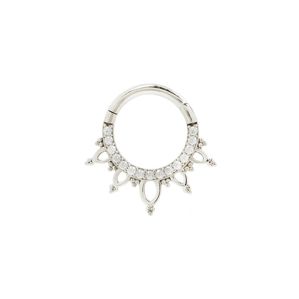 Deze Indra Clickring heeft een prachtig ontwerp met een rij schitterende Swarovski kriastallen. Deze opvallende combinatie creëert een uniek, opvallend contrast dat een vleugje moderne elegantie toevoegt aan elke piercing. Perfect om een statement te maken, de Indra Clicker tilt moeiteloos je stijl naar een hoger niveau.