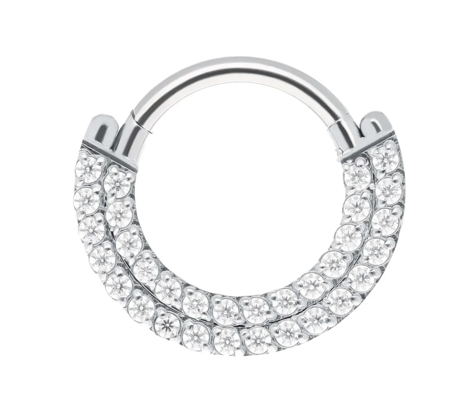 De Bea clicker Ring is een verfijnd alternatief voor mensen die op zoek zijn naar iets stijlvol én duurzaam. Deze ring van 16G en 8mm is gemaakt van implantaatkwaliteit titanium (F-136), dat lichtgewicht, corrosiebestendig en perfect is voor langdurig gebruik. Op het gepolijste oppervlak van de ring bevindt zich een fijne rij kubische zirkonia steentjes voor precies de juiste hoeveelheid schittering, een mooie toevoeging voor septum- en daithpiercings.