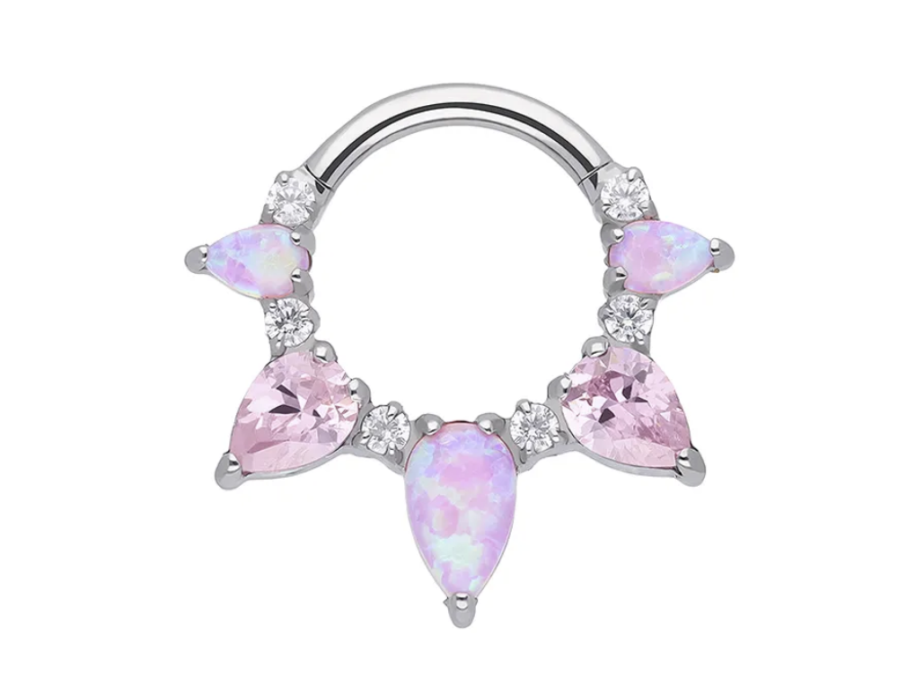 De delicate en vrouwelijke Clara – White/Pink Clicker Ring is een blikvanger in elke piercingcollectie. Gemaakt van implantaatwaardig Titanium (F-136), is hij hypoallergeen en super duurzaam. De witte opaal en roze zirkonia creëren een zacht en verfijnd effect dat prachtig staat bij elke huidskleur. Met een diameter van 8 mm en een dikte van 16G is dit een veelzijdige optie voor septum-, daith- of kraakbeenpiercings. De soepele sluiting en het scharnierontwerp zorgen voor snel en veilig gebruik – perfect voor drukke piercers en piercings. Deze luxe titanium clicker ring gaat lang mee en blijft glanzend en comfortabel voor de klant die de voorkeur geeft aan een subtiel, maar toch mooi en veilig sieraad.