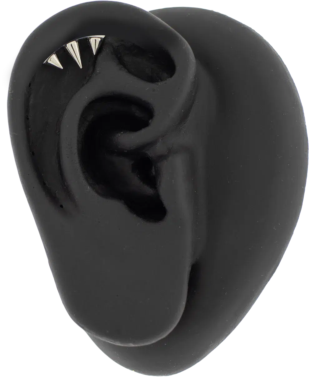 Maak een statement met deze opvallende, hidden helix top, voorzien van een strak ontwerp met drie spikes voor een gedurfde, stoere look. Nauwkeurig vervaardigd, inclusief een 25G schroefloze pin, zorgt het voor een veilige en comfortabele pasvorm die compatibel is met alle gangbare schroefloze sieradenmerken. Perfect voor liefhebbers van unieke, opvallende sieraden: dit verborgen helix-uiteinde combineert functionaliteit naadloos met een stoere stijl. De middelste spike is 5 mm lang, de spikes aan de zijkanten zijn 4 mm lang. Het sieraad is in totaal 13,5 mm lang en 6,5 mm hoog.