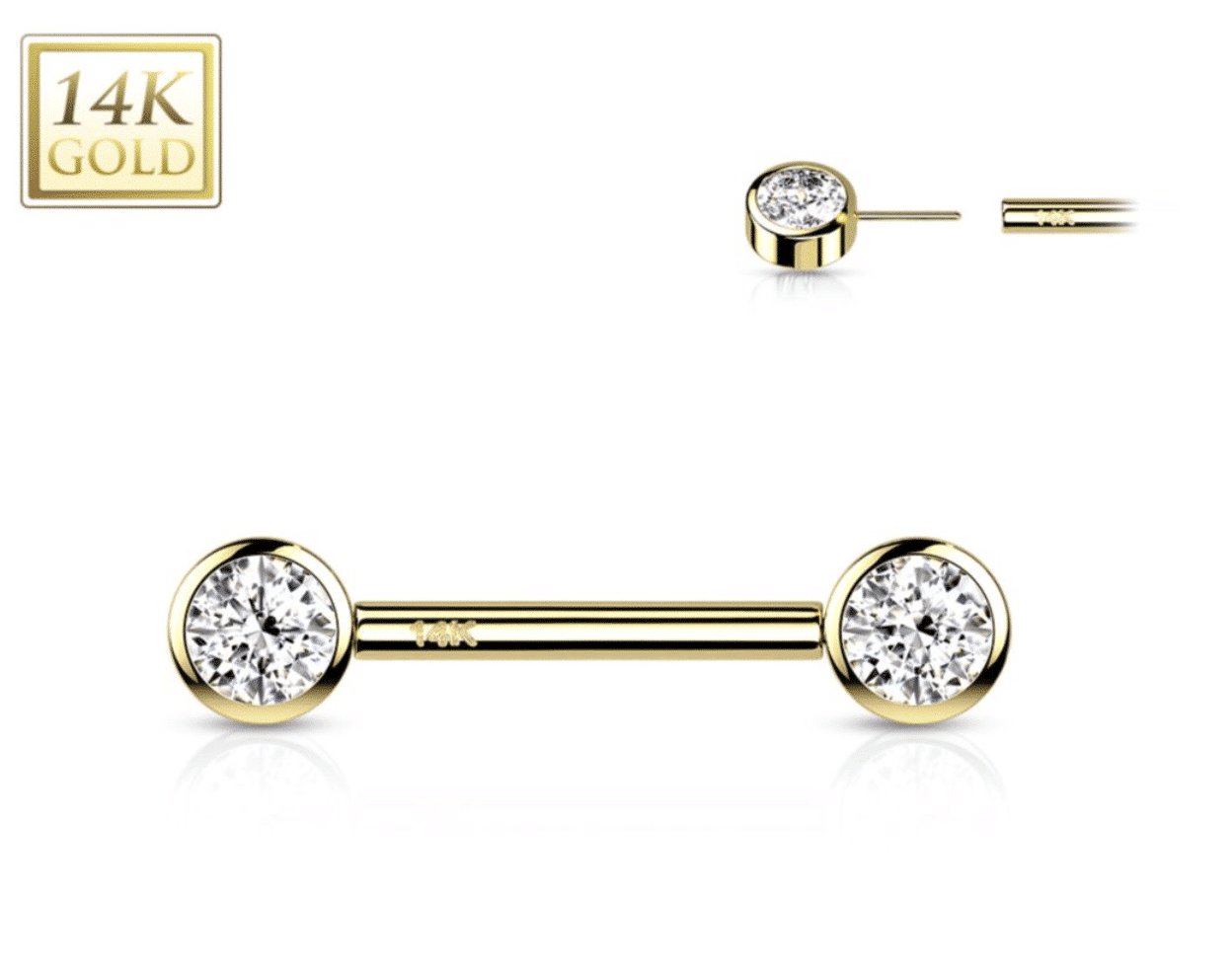 Deze schitterende tepelpiercing is gemaakt van 14 Karaats Goud en is ingezet met 2 heldere, ronde kristallen van 5mm. De staafdikte van deze piercing is 1.6mm en de lengte van het staafje 12mm, 14mm of 16mm.