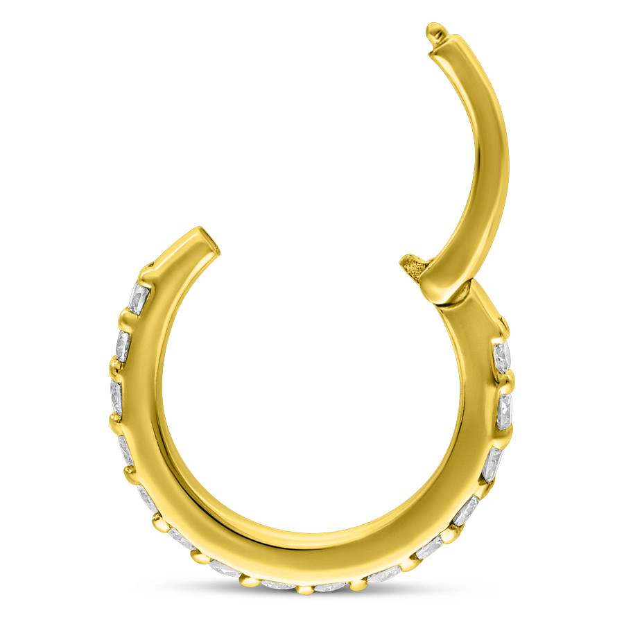 Deze segmentring is gemaakt van 14 Karaats Goud, heeft een vast segment en is rondom ingezet met echte diamantjes. De ring is geschikt als vervanging voor verschillende oorpiercings, zoals bijvoorbeeld de Helix, tragus of Daith. De ring is makkelijk te openen en te sluiten en heel comfortabel om te dragen. De ring is verkrijgbaar in een staafdikte van 1.2mm en in verschillende diameters.